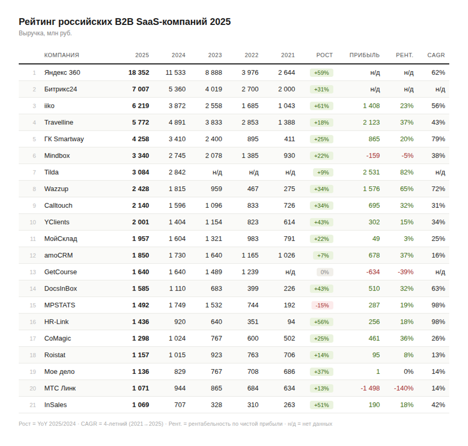 Рейтинг SaaS-компаний России по итогам 2025 года: лидером стал Яндекс 360